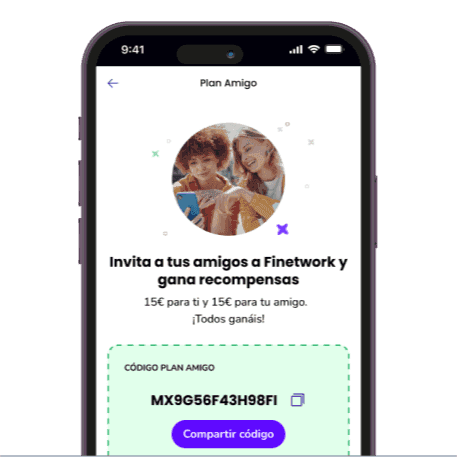 Accede a tu Plan amigo a través de la app, copia y comparte tu código de invitar amigo y consigue 15€ por cada persona que se haga Finetwork con tu código.