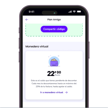 Cada mes te descontaremos hasta un 25% de tu factura hasta agotar el saldo que tengas en tu monedero. Podrás invitar a tantos amigos y familiares como quieras. Y recuerda tu amigo también conseguirá 15€ en su monedero.